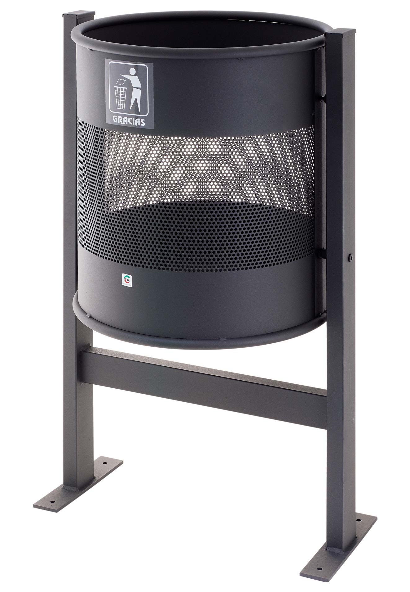 Papelera metálica perforada para exterior. Montada sobre bastidor para fijar al suelo. Sistema basculante para facilitar su vaciado. Sistema basculante. Capacidad: 40 l. PESO NETO: 10,6 kg. COLORES: Grafito y verde. Consultar otros colores.