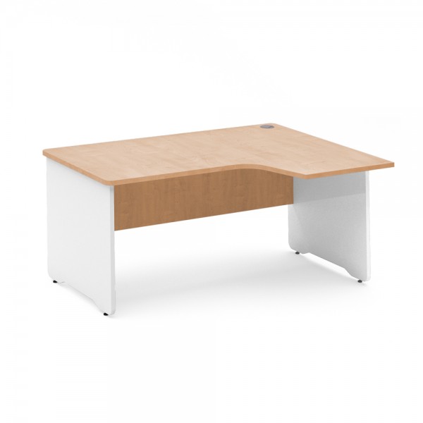 Compuesta de pies realizados en melamina de 25 mm de grosor, con canto de 2 mm del mismo color, faldón en melamina de 19 mm de grosor con canto de 2 mm del mismo color, y tablero de melamina de 25 mm de grosor con canto de 2 mm de grosor del mismo color. Disponible en acabados Haya, Gris, Blanco y Roble. Incluye niveladores de regulación en altura de hasta 2 cm.
