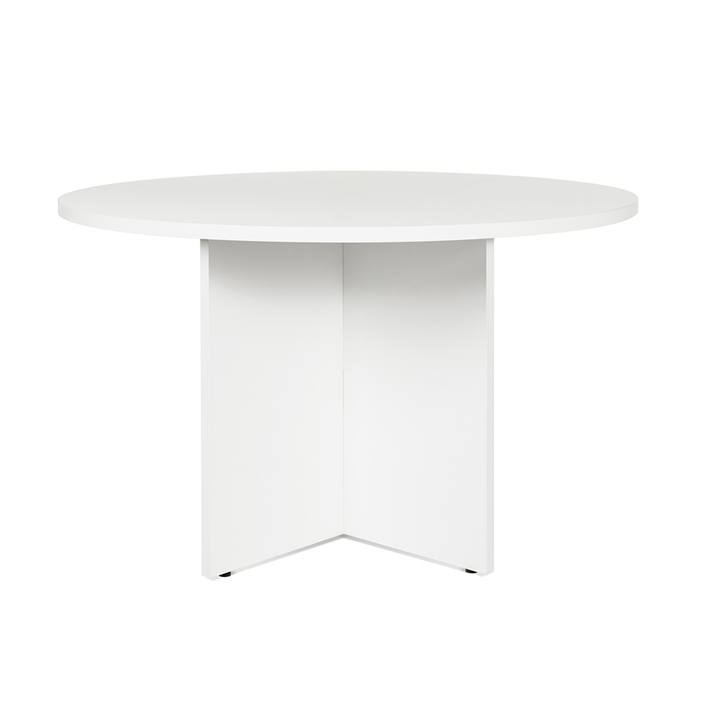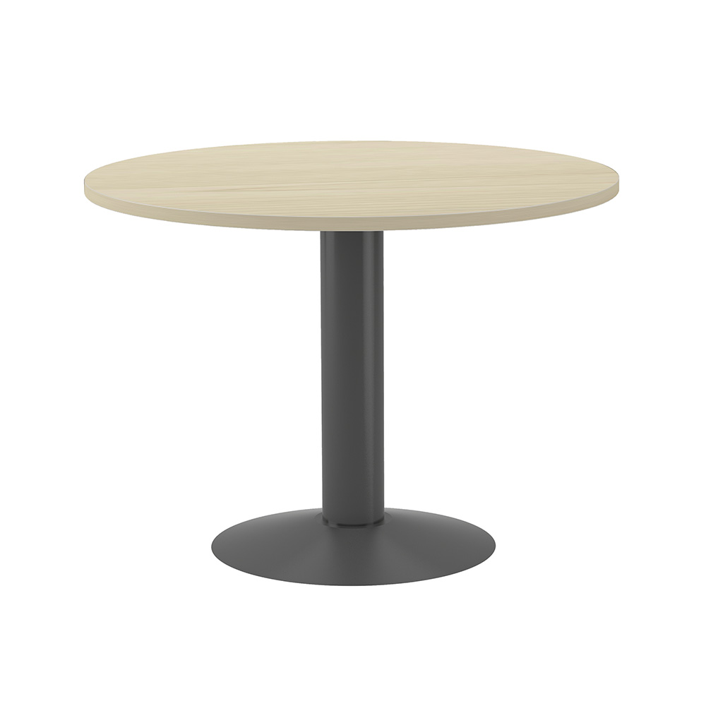 Mesa de reunión circular, con estructura de acero, pensada para atender a clientes, proveedores, trabajos en grupo, y cubrir las necesidades de reunión, con la intención de mejorar la funcionalidad de su oficina y área de trabajo. Compuesta de pie de columna realizado en plancha metálica pintada epoxy, color según modelo, y 5 acabados de tablero diferentes: haya, gris, blanco, cristal o roble.
