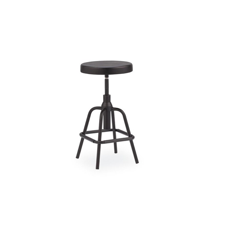 Taburete formado por un pie de 5 puntas, fabricado en tubo de 22 mm de diámetro. Caña Central fabricada en tubo de 50 mm de diámetro. Husillo roscado de 25 mm, de diametro. Placa roscada y soldada al husillo de 4 mm de espesor, con nervaduras de refuerzo. Aro posapies en acero inoxidable de 18 mm de diámetro, remachada a los pies. Asiento fabricado en polipropileno, atornillado a la placa nervada. Pintada mediante recubrimiento de polvo epoxi. GRIS