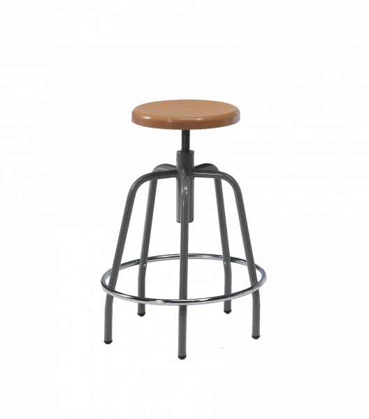 Taburete formado por un pie de 5 puntas, fabricado en tubo de 22 mm de diámetro. Caña Central fabricada en tubo de 50 mm de diámetro. Husillo roscado de 25 mm, de diametro. Placa roscada y soldada al husillo de 4 mm de espesor, con nervaduras de refuerzo. Aro posapies en acero inoxidable de 18 mm de diámetro, remachada a los pies. Asiento fabricado en polipropileno marrón, atornillado a la placa nervada. Pintada mediante recubrimiento de polvo epoxi. VERDE