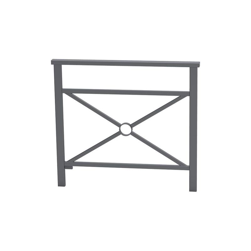 Longitud: 1000 mm. Estructura simple cruz, chapa cortada de espesor 3 mm o con barrotes. Altura desde el suelo: 900 mm. Altura sin cabezal: 1080 mm. Estructura: Tubos de acero 40 x 40 mm. Pilona y pasamanos en tubos de acero de 50 x 30 mm; distancia al suelo: 150 mm. Acero pintado sobre zinc según nuestros colores. Instalación por sellamiento directo en hormigón (opción pletinas). Opción: Kit de movilidad.