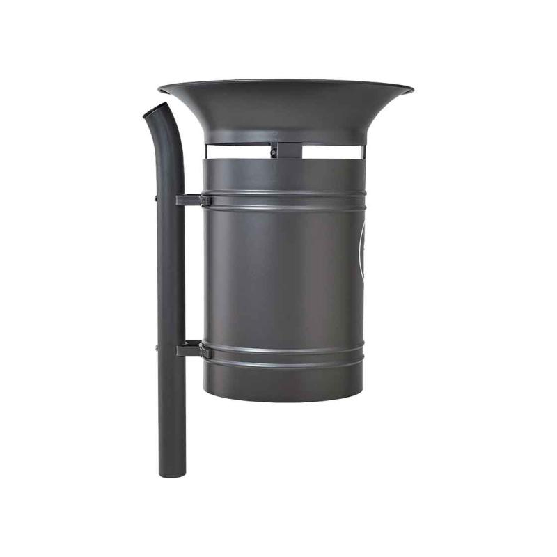 Cuerpo sujetado en la parte superior por 2 semi arcos horizontales de acero plano, uno de los cuales se levanta para inclinar el cuerpo de la papelera a 45º.