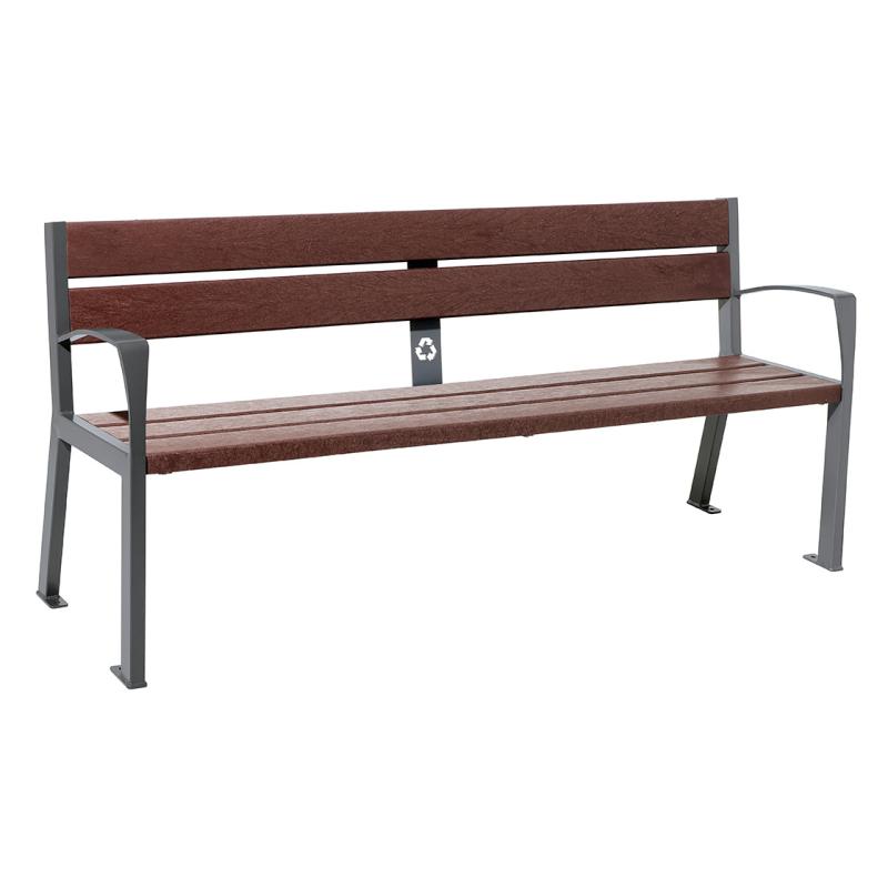 Longitud: 2000 mm. Versión con pies de fundición de alta calidad cuya protección anti-corrosión esta reforzada con una acabado metalizado o negro (RAL 9005). Laminas de madera resinosa (color « caoba » o « roble claro », a elegir). Fijación sobre pletinas, varillas de anclaje suministradas. Peso : 45 Kg