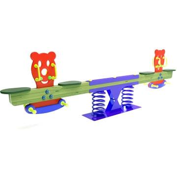Balancín de muelles con figura de Platillo volante, compuesto por tres muelles anti-pinzamiento que garantizan una seguridad completa al niño, una plataforma de Ø1000mm, un poste central de tubo redondo de Ø100x2mm y un disco superior de asidero para sujetarse.