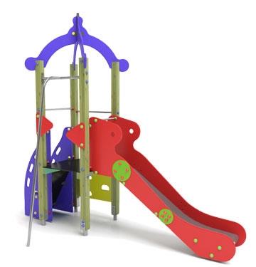 Conjunto formado por dos torres con plataformas de 90x90cm, una torre con cubierta a dos aguas y la otra con dos arcos cruzados simulando una pérgola. Altura plataformas 0,90m. El juego ofrece total estabilidad y seguridad. Las torres van unidas entre sí mediante una pasarela rígida protegida por paneles. El acceso a una de las torres se realiza mediante escalera con barra quitamiedos y panel trasero de la escalera cerrado. En la torre opuesta existe un tobogán recto de deslizamiento, también protegido con barra quitamiedos. En la parte inferior de las torres se ubican dos zonas protegidas mediante paneles, en las cuales se pueden realizar actividades lúdicas variadas. Barras quitamiedos en acero inoxidable. Tornillería fabricada en acero galvanizado oculta mediante tapones de nylon que impiden su manipulación por parte de los usuarios. Anti-vandálico. Suministro posible montado o desmontado para envío paletizado.