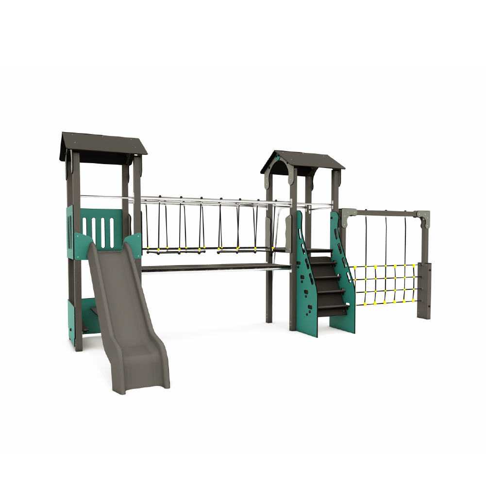 Estructura formada por una torre a dos alturas, con cubierta a dos aguas y plataforma de 2,10m x 1,20m en altura 1,30m. En la parte superior de la torre se ubica una casita con asientos, simulando una cabaña, a la que se puede acceder mediante una escalera o un panel de trepa perforado y descender mediante un tobogán.