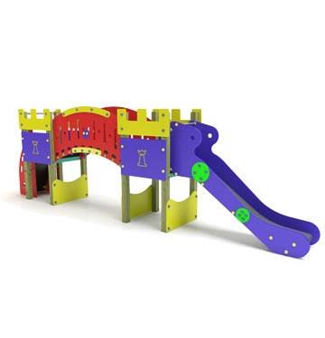 Conjunto formado por dos torres con cubiertas a dos aguas y unidas entre sí por una pasarela colgante de cuerdas. El acceso a una de las torres se realiza mediante una escalera inclinada, a su vez esta torre posee una barra de bomberos de descenso. En la otra torre existe un tobogán recto de deslizamiento. En la parte inferior de esta segunda torre se ubica una zona de juego en la que se aloja una mesa y un banco de juego. Todo ello protegido mediante paneles de vistosos colores. El conjunto lleva adosados un columpio de una plaza y una red de trepa.