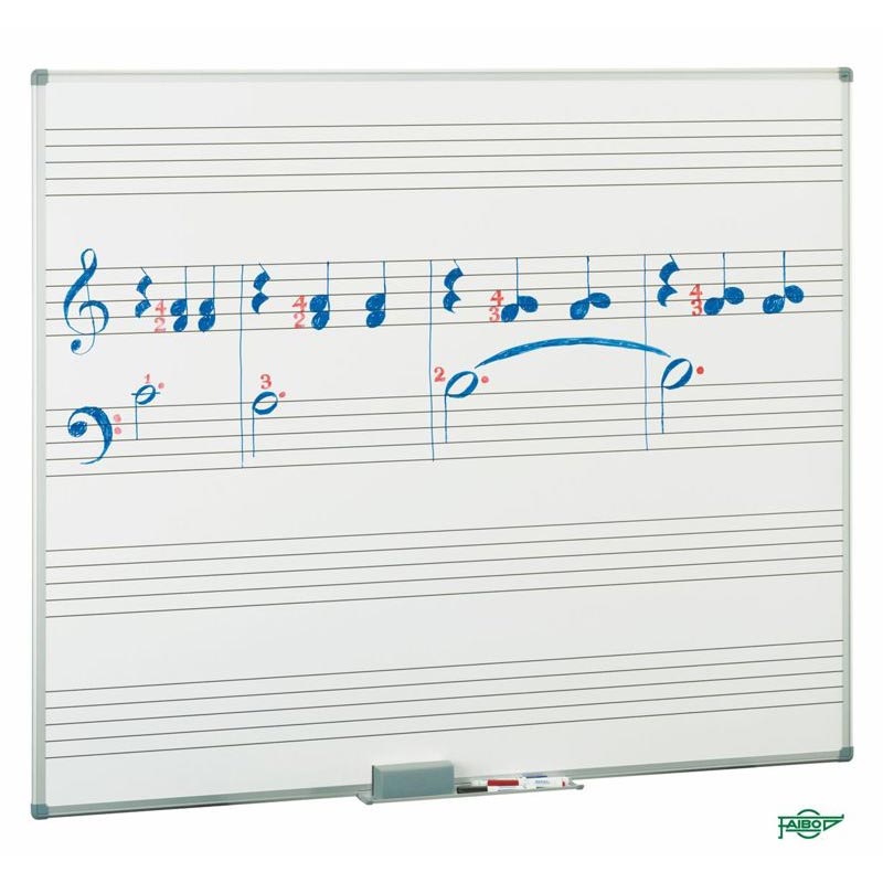 Pizarra Pentagrama estratificada BLANCA con marco de aluminio de 122×200 cm. Marco de aluminio y cantoneras decorativas. Superficie estratificada blanca, especial para escribir con rotuladores para pizarra blanca. Incorporan 5 pentagramas indelebles. Suministradas con 1 cajetín de aluminio y 1 cajetín de plástico de 40 cm., elementos para colgar mapas y de fijación. Opcionalmente se pueden suministrar cajetines de cualquier medida para todas las pizarras.