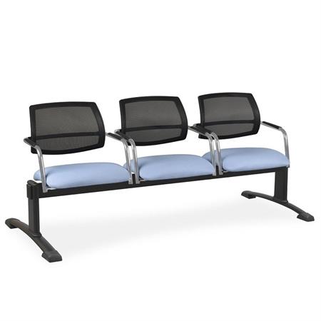 Respaldo alto. Soportes de anclaje de los asientos metálicos pintados en color negro. Traviesa de tubo de 80x40x2 mm, con acabado pintado en negro. Patas metálicas de tubo elíptico de 60x30x2 mm., con vertical de tubo oval de 90x30x2 mm. Brazos fijos metálicos, cromados, formando parte de la estructura con apoyabrazos en poliamida color negro. Opción de incorporar mesa adicional en melamina color negro en cualquier posición, con un montaje máximo de 4 plazas de bancada más la mesa adicional.