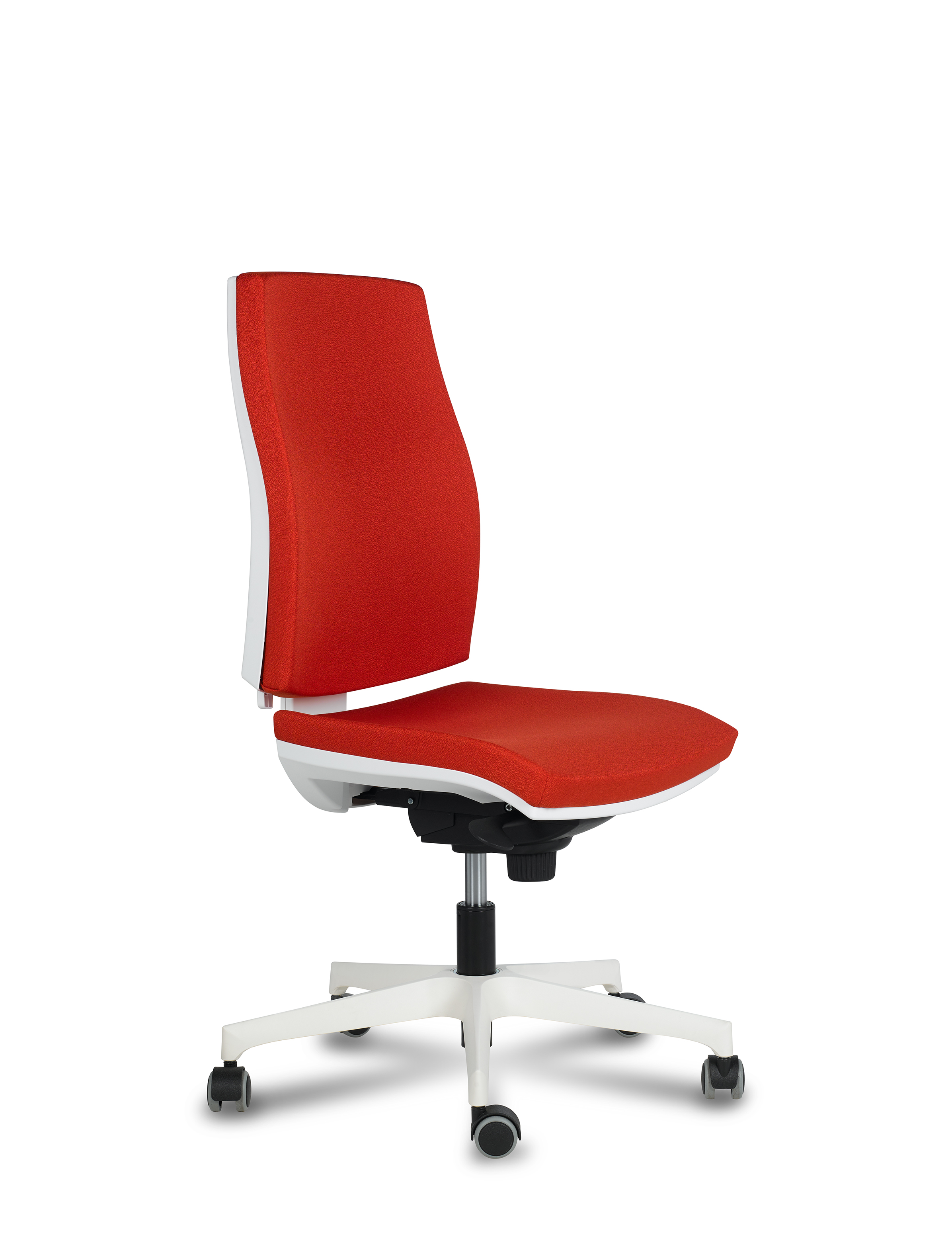 Respaldo alto tapizado, mecanismo sincron, regulación de profundidad de asiento, sin brazos, base de poliamida, regulación de altura de asiento.