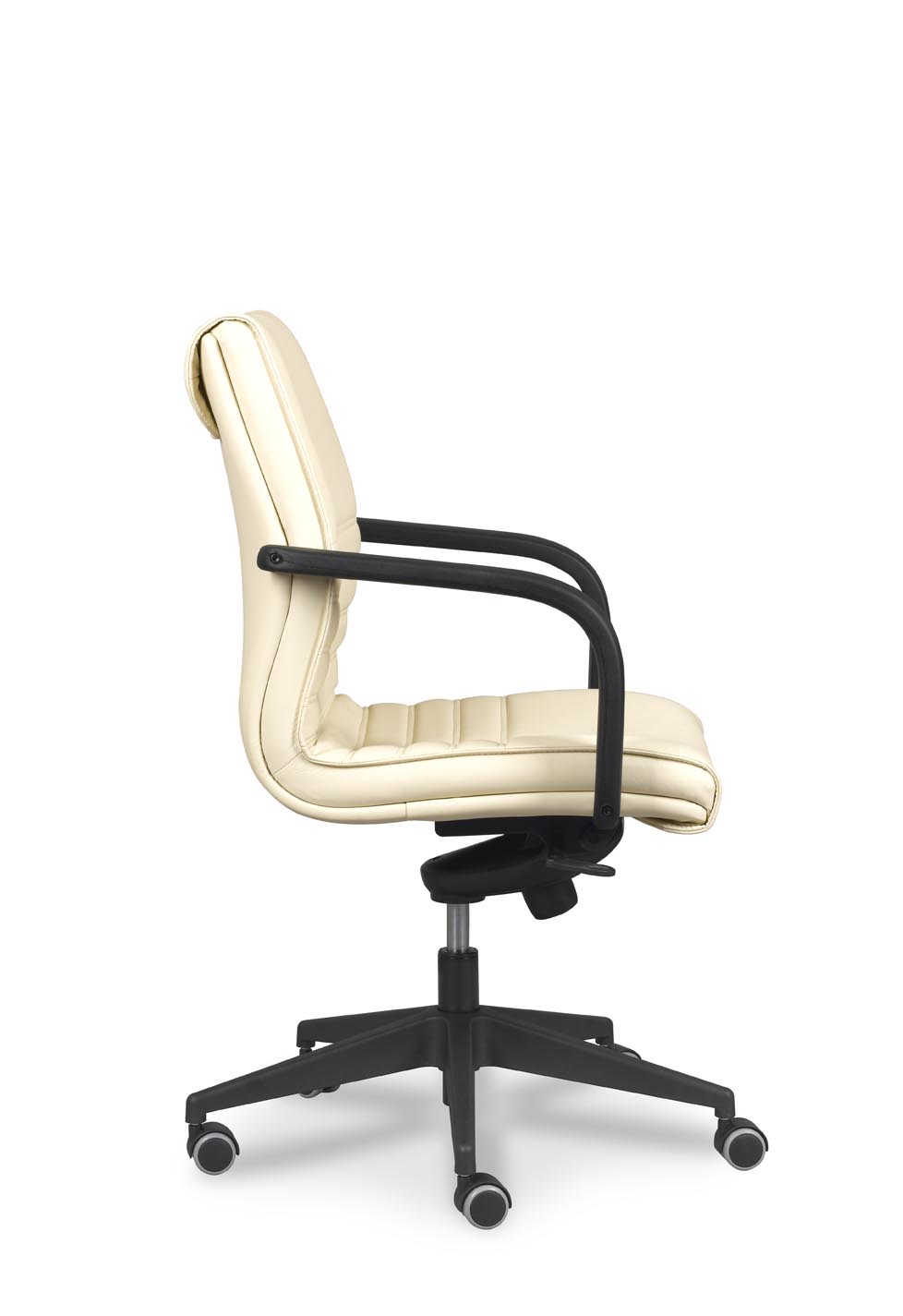 Sillón de dirección con asiento y respaldo alto acolchados en espuma moldeada de 30 kg/m³, tapizado. Armazón interior en tubo de acero de 20x1,5 mm. Regulación de altura del asiento por columna neumática. Sin regulación de inclinación del respaldo, y opcionalmente, regulación de inclinación del respaldo mediante mecanismo de basculación a elegir entre económico, basculante normal o basculante centro-avanzado multiposición con sistema antirretorno y regulación de tensión. Brazos fijos de poliuretano integral en color negro. Base de poliamida en color negro y, opcionalmente de aluminio pulido. Ruedas de rodadura blanda de serie. Altura total: 106-114 cm. Altura asiento: 48-56 cm. Ancho total: 59 cm. Profundidad asiento: 46 cm.