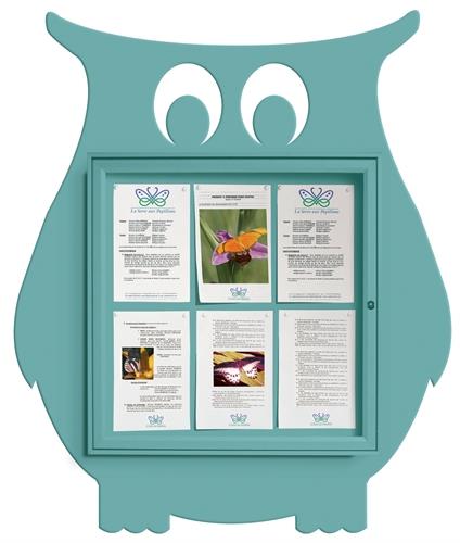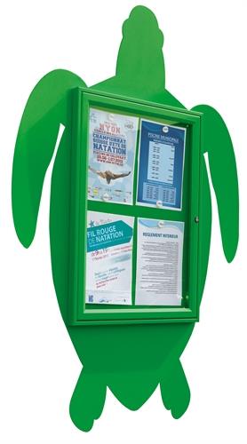 Vitrina Oso de 750 x 550 mm. la vitrina (4A4); y de 1024 x 743 mm. su totalidad. Marco de aluminio, espesor 30 mm. Fondo imantado de chapa. Acristalamiento Plexichoc® espesor 4 mm. Cerradura “de seguridad“ con 2 llaves. Junta de estanqueidad de elastómero y orificios anticondensación. Silueta de chapa de 2 mm. 4 colores estándares: amarillo (RAL 1017), rojo (RAL 3020), verde (RAL 6018), turquesa (RAL 6034). 22 Kg.