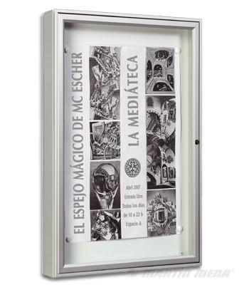 Vitrina TRADICIÓN de Alt. 400 x 550 mm. "2 A4" Marco de aluminio anonizado. Espesor 30 mm. Puertas batiente reemplazable y reversible, sin herramientas ni desmontaje de la vitrina. Acristalamiento en plexichoc espesor 4 mm. Bisagra integrada. Cerradura “de seguridad“ con 2 llaves sobre el perfil de la puerta. Junta de estanqueidad de elastómero y orificios anticondensación. Fondo chapa electrozincada. Acabado : anodizado color plata.